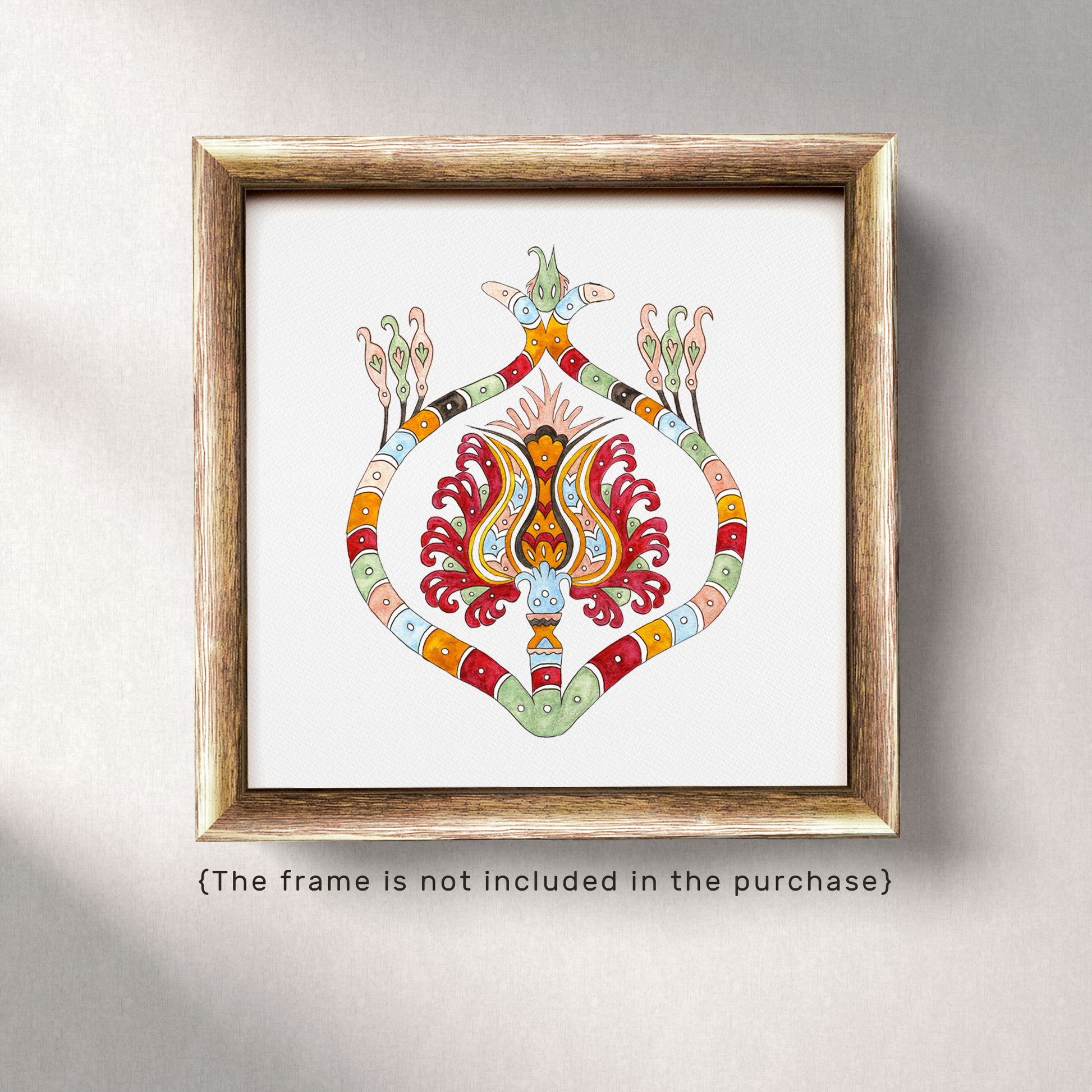 The Flower Engulfed in Snake art print is a unique design inspired by a piece of embroidery from the island of Skyros that was crafted in honor of the birth of Ariadne's daughter.